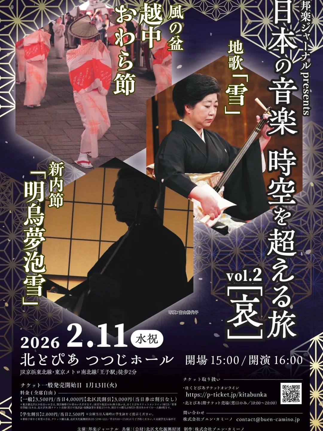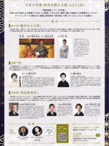 2026.01.19 日本の音楽 時空を越える旅 2026・2・11北とぴあつづじホール ◆日本の音楽 時空を越える旅 「哀」 場所:北とぴあつづじホール 料金:一般 3,500円/当日 4,000円 学生 2,000円/当日 2,500円 Tweet Share Hatena Pocket RSS feedly Pin it 新内協会主催 新内合同研修演奏会 ... 第55回 邦楽演奏会 令和8.3/...
